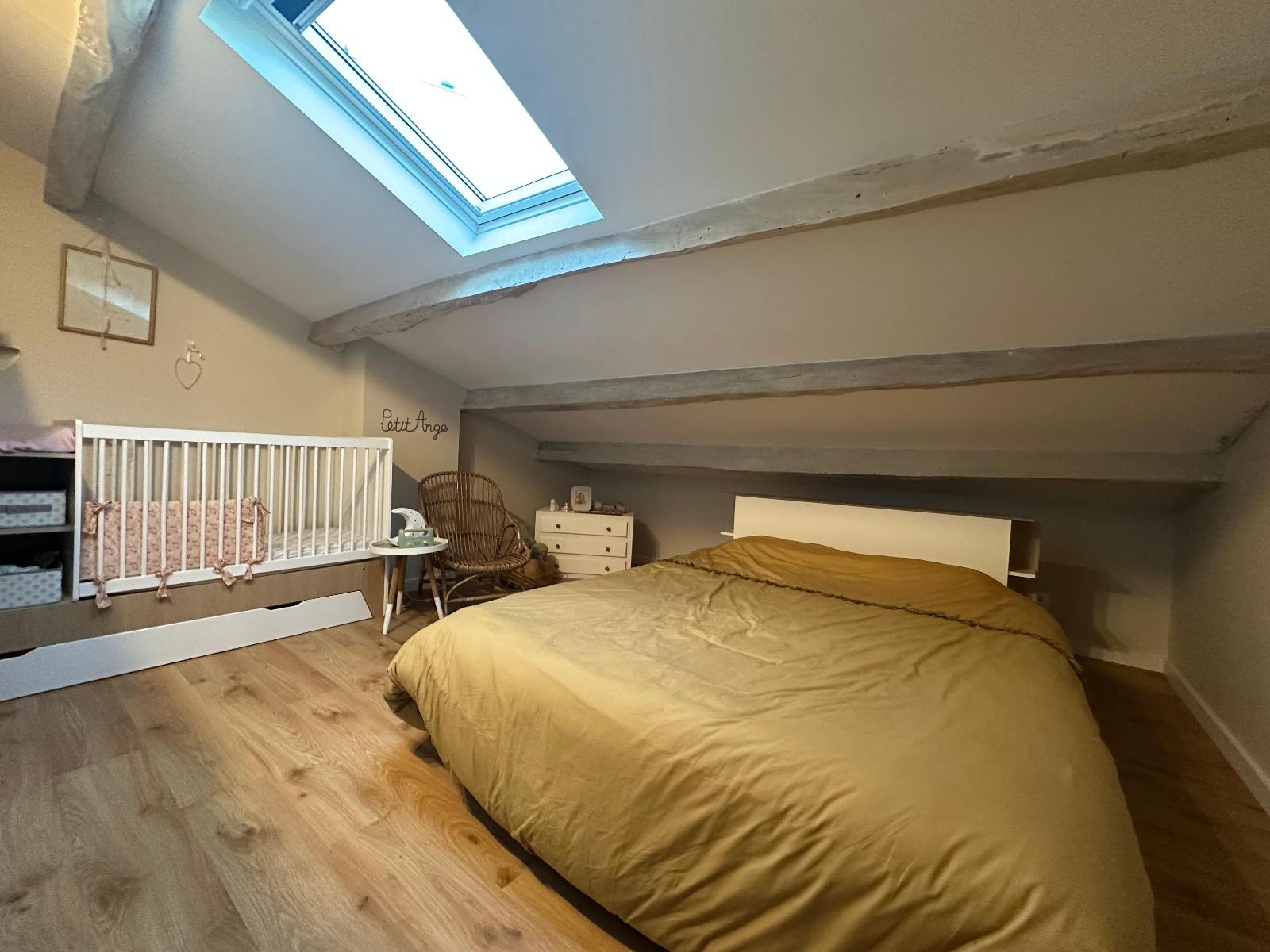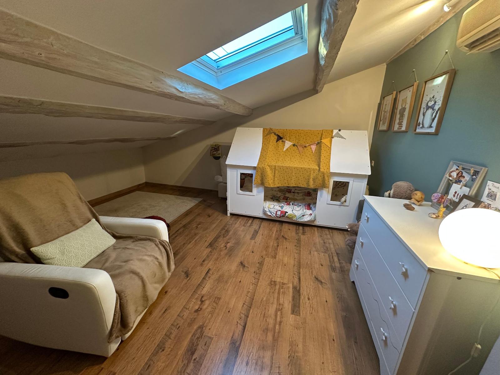 coté nuit, la maison dispose de trois chambres, une en rdc et deux autres à l'étage mansardées, une salle de bains moderne et des wc séparés