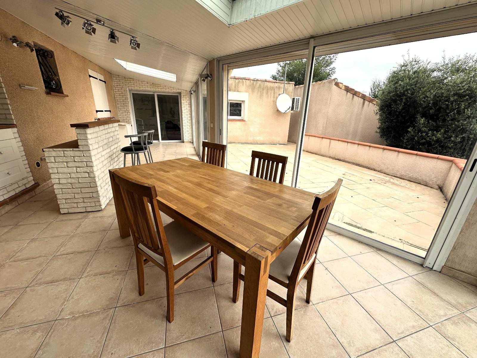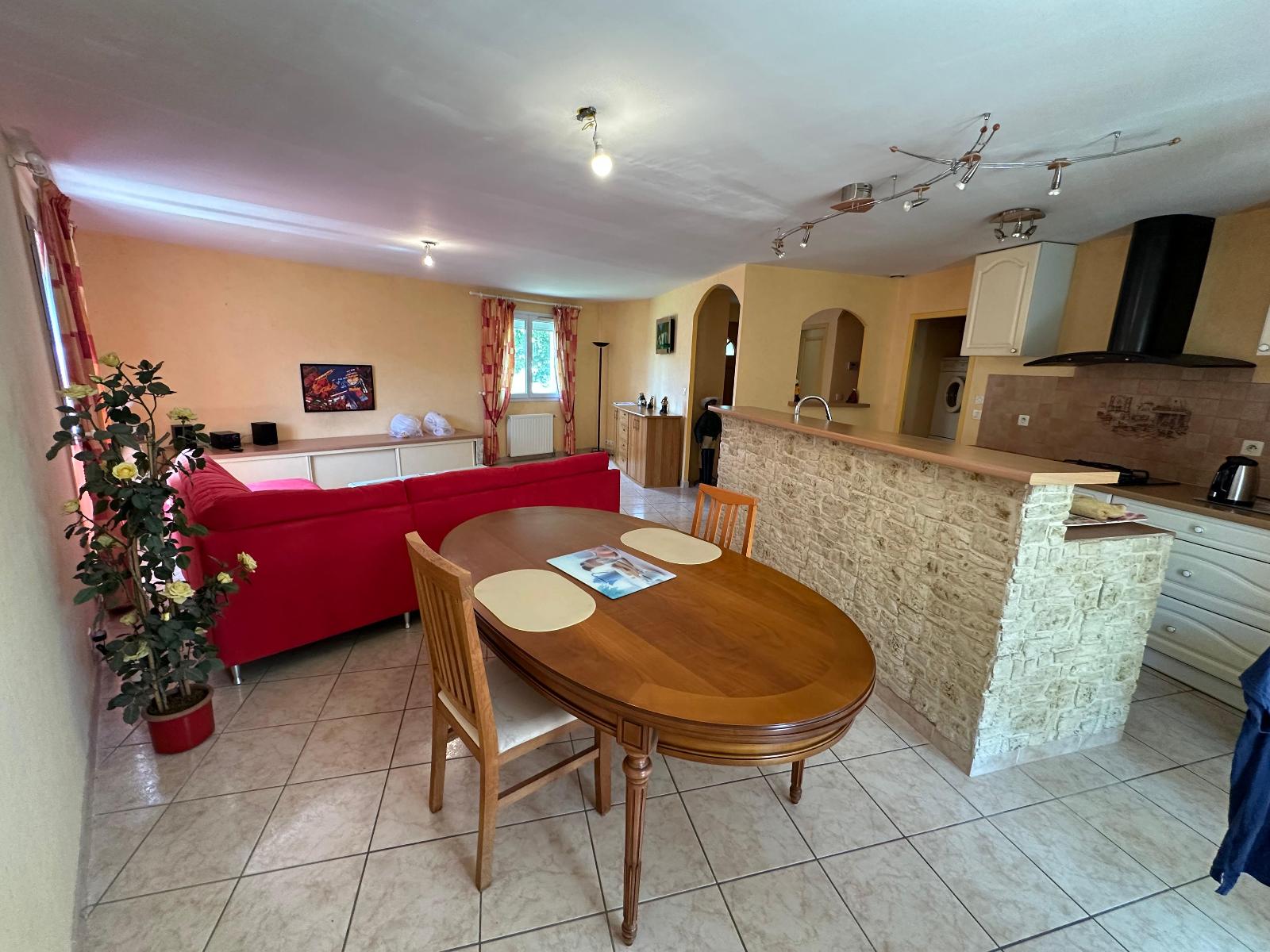 - une spacieuse pièce de vie avec cuisine américaine, ouverte sur une véranda chauffée, une chambre et une terrasse extérieure
